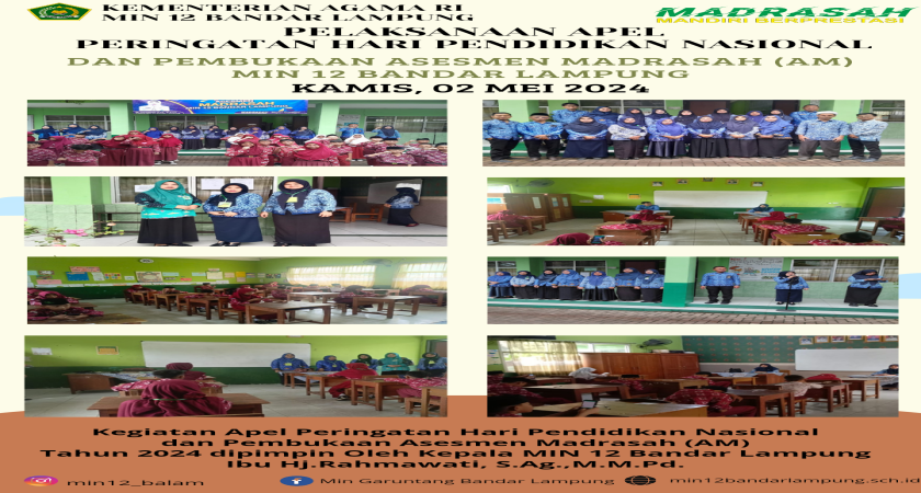 Bandar Lampung, MIN 12 (Humas) --- Hari Pendidikan Nasional Tahun 2024 bertepatan pada hari ini Kamis, 2 Mei 2024 bersamaan dengan pelaksanaan Asesmen Madrasah (MI) pada jenjang MI hari pertama. MIN 12 Bandar Lampung melaksanakan Apel Peringatan Hari Pendidikan Nasional dan Pembukaan Asesmen Madrasah.